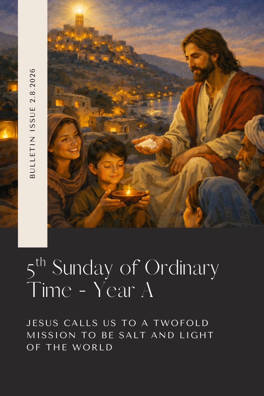 This week’s bulletin centers on Jesus’ call to be “salt of the earth” and “light of the world,” reminding us of our baptismal mission to reflect Christ in everyday life. Fr. Emmanuel’s reflection invites us to live with courage and faithful witness, while parish updates highlight faith formation initiatives, opportunities for Eucharistic Adoration, the Annual Appeal, and ways to serve our neighbors through the Mercy House food pantry. Together, we continue building a Christ-centered community rooted in love and action.